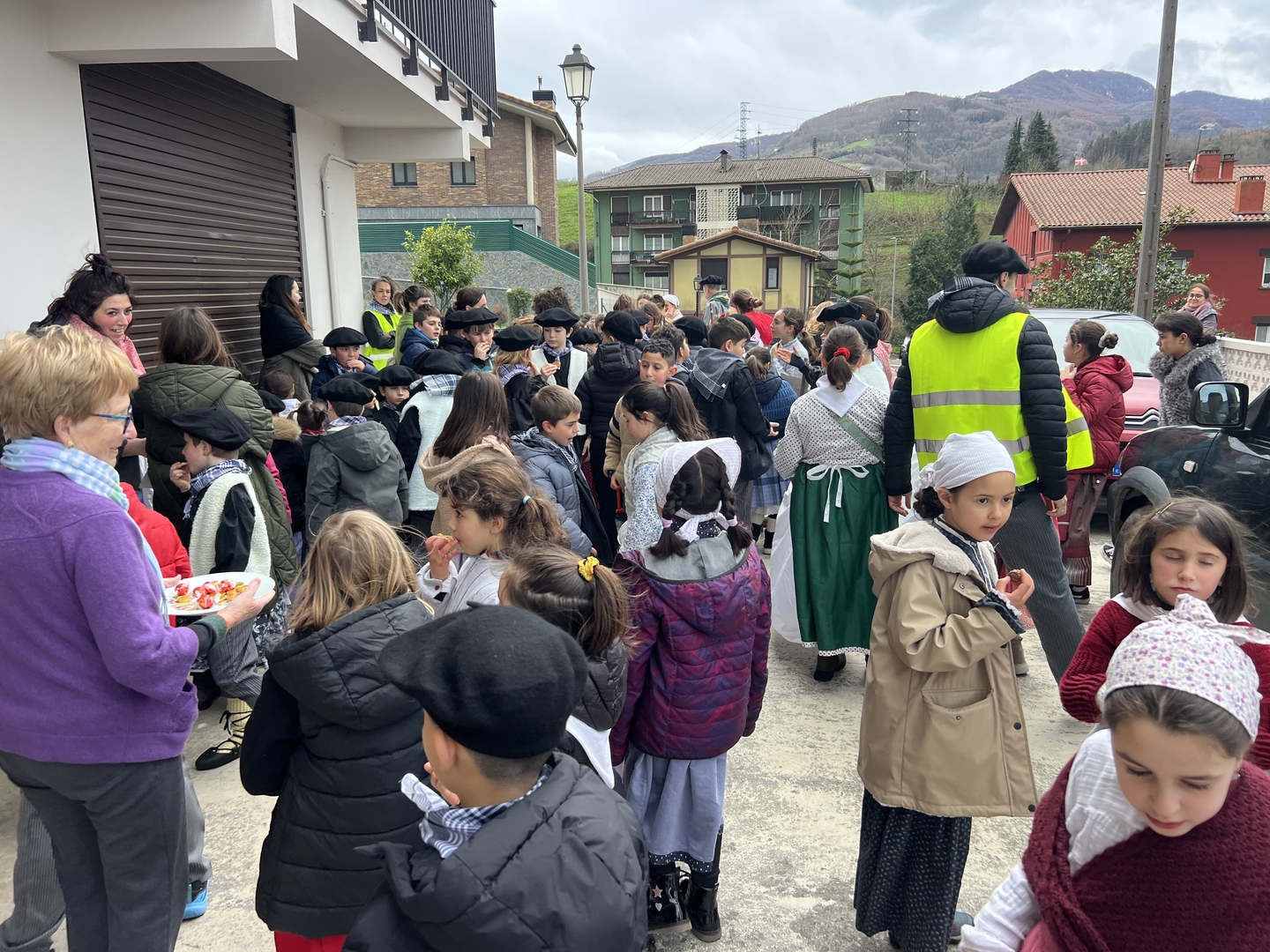 Ondoren, Haur Hezkuntzakoekin plazan elkartu eta elkarrekin egin genuen herriko kaleetan zehar buelta. Irurako okindegian koplak abestu ostean, txokolatezko ogitartekoa ere eman ziguten. Euria hasi zuenez, amaiera azkar eman behar izan genion eta ezin izan genuen plazan abestu.